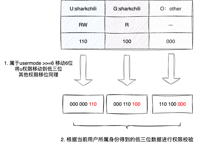 - 若是所属组则移位3位将所属组的权限3bit移动到最低3位得到100执行权限校验,当前文件属于sharkchili用户组,当前用户在test组,并非所属组,触发other权限校验