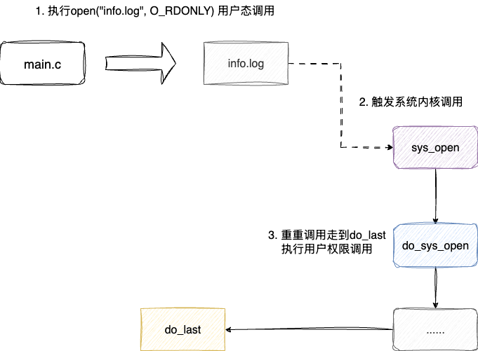 对应就会执行open函数以只读模式执行调用,对应代码层面对执行链路大体是通过用户态的open函数调用指明文件名和读写模式,然后触发内核调用执行sys_open函数其内部会携带用户需要打开的文件名和需要的文件访问模式经历重重调用最终走到do_last进行路径检查和权限校验等重要步骤: