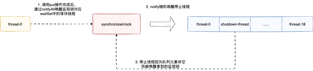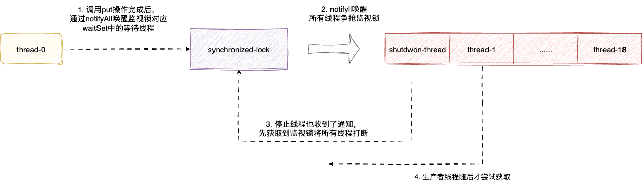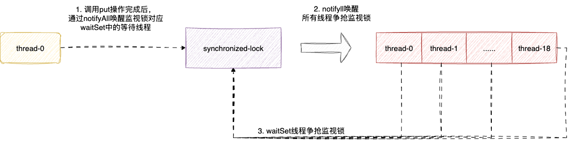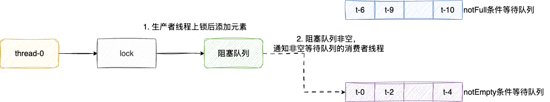 - 等待队列非满的生产者线程存到一个队列,待消费者完成元素消费后通知这个队列