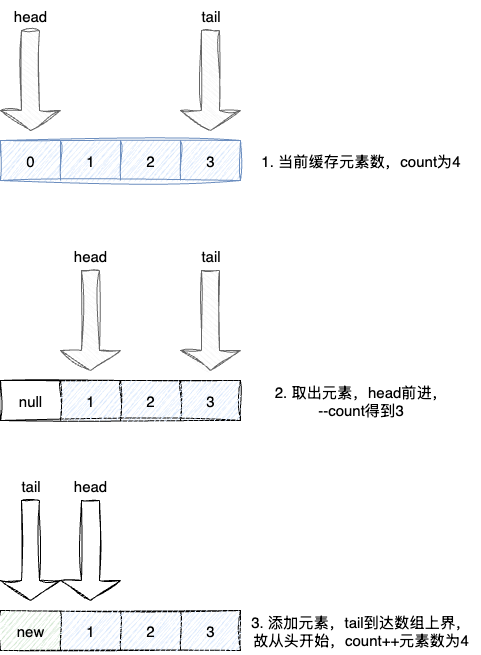doPut函数,判断是否到达数组末端,若到达则直接将元素存到索引0,并累加count - 进行元素取操作时,互斥上锁执行