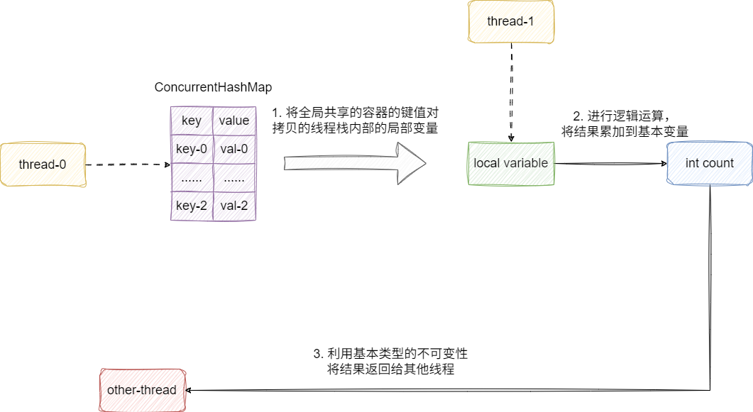 当然维持对象引用的栈封闭时,程序员还是需要额外注意一下引用对象的逸出问题,例如上文示例中map 引用就局限在当前线程栈内,利用线程栈私有的特性,即使map是非线程安全的对象,也可以利用栈的特性保证即时运算的准确性。