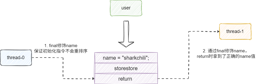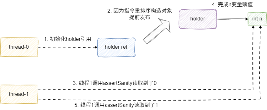 所以如果线程并发初始化时,可能看到一个尚未初始化好的Holder ,使得其他并发线程通过assertSanity访问这个变量就既有可能存在不一致而报错的情况,所以必要时我们建议需要保证并发安全性的成员字段需要在构造函数内部采用final关键字修饰: