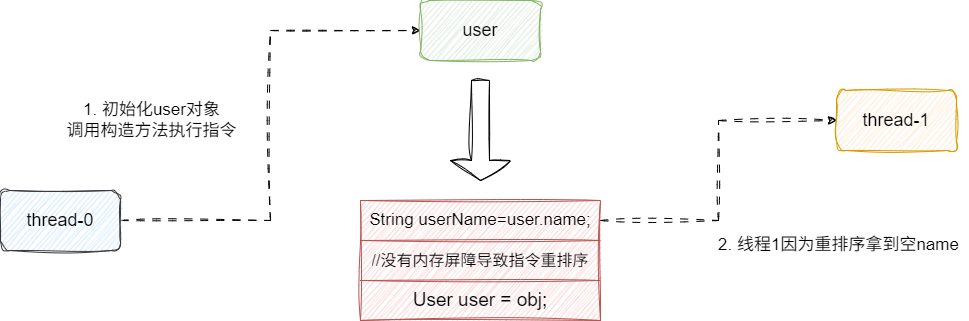 引发异常的场景如下所示,因为构造函数的指令重排序等原因,显示的访问就可能存在线程2读取不一致的情况。