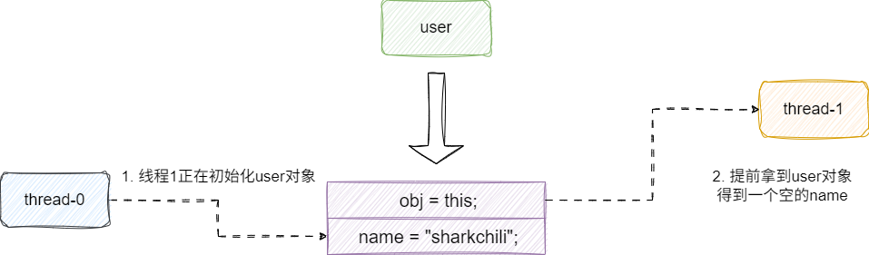 另一个典型例子就是下面这段代码,我们仅仅需要通过构造方法对外发布User实例,却因为构造方法的public修饰符使得this被隐式发布导致逸出,这也是一种典型的错误: