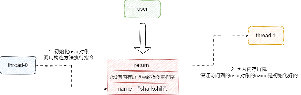 下面这段代码就是典型的就存在构造发布不可见的情况,因为构造函数初始化存在指令重排序,实际上下面这个构造初始化可能存在: