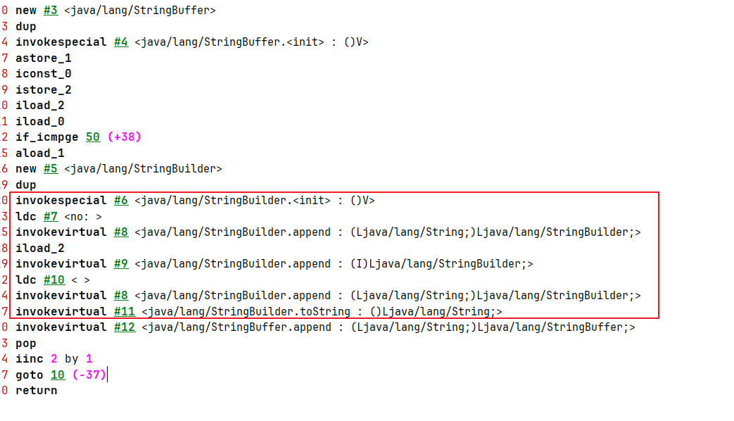 从编译后的字节码可以看出,因为对象没有发生逃逸,中间字符串拼接操作都是通过StringBuilder完成操作的,在StringBuilder完成字符串拼接之后再追加到StringBuffer上: