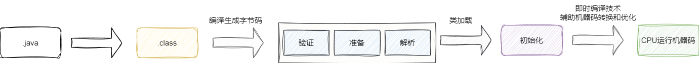在初始化阶段完成后,执行引擎不断将调用到的字节码翻译成机器码交由计算机执行,Java字节码转为机器码之间还有一步转换,我们称之为既时编译:
