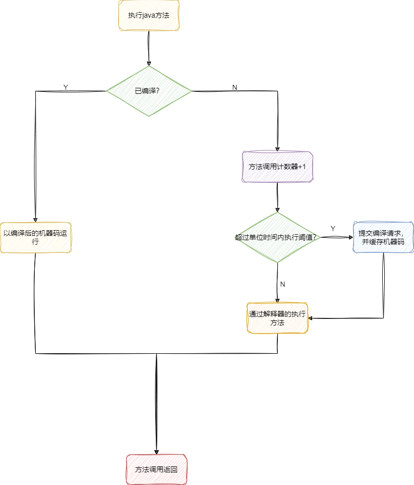 这也就意味着当方法调用在一段时间(而非永久叠加)次数达到10000次的时候,就会提交一个编译请求,后续执行时都直接用缓存中的编译后的机器码直接运行: