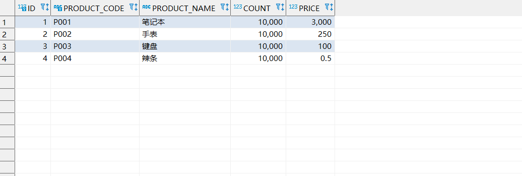 我们不妨来演示一下这个问题,首先我们先来看看商品表,可以看到P001为笔记本,P002为手表: