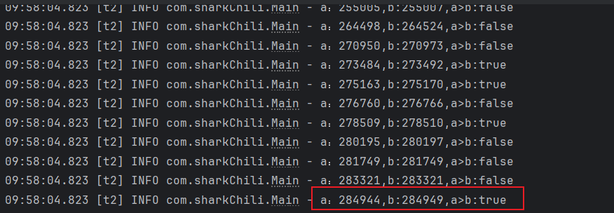 结果出现了很奇怪的现象,我们发现进行了某些线程得到了进入了a<b的if分支,偶发的输出a>b结果却为true: