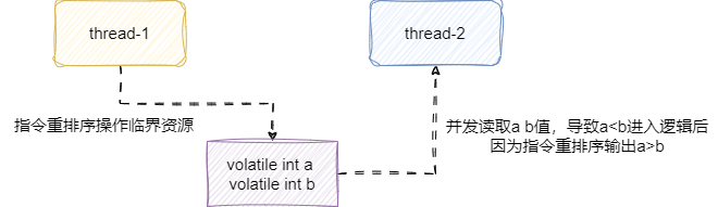 很明显导致问题的原因就是两个线程进行并发操作时没有保证单位时间内只有一个线程操作临界资源,结合as-if-serial规则在单线程的情况下,指令重排序只能对不影响处理结果的部分进行重排序,这就导致并发操作其间a、b结果大小可能是瞬息万变的。