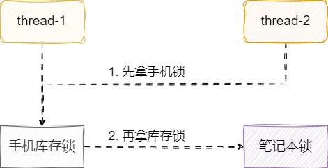 例如用户1想购买笔者本和手机,它就必须同时拿到手机和笔者本两个商品的锁才能操作资源。这种做法可能会导致上述所说的死锁问题,有个用户打算先买笔者本再买手机,另一个用户打算先买手机再买笔者本,这使得他们获取锁的顺序是相反的,如果他们同时执行业务逻辑。双方先取的各自的第一把锁,准备尝试获取第二把锁的时候发现锁被对方持有,双方僵持不下,造成线程死锁。