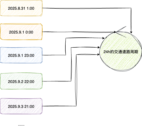 为了规避相同周期频率导致的lockstep即锁同步采样,我们可以适当降低频率避免与交通周期时间同步,保证一天的数据能够在一个周期内被完整地采集到,而本例最好的做法就是将定时间隔改为23h,这样一来每个23天的样本周期就会得到一天中所有时间的数据就能做到全面地了解到交通情况: