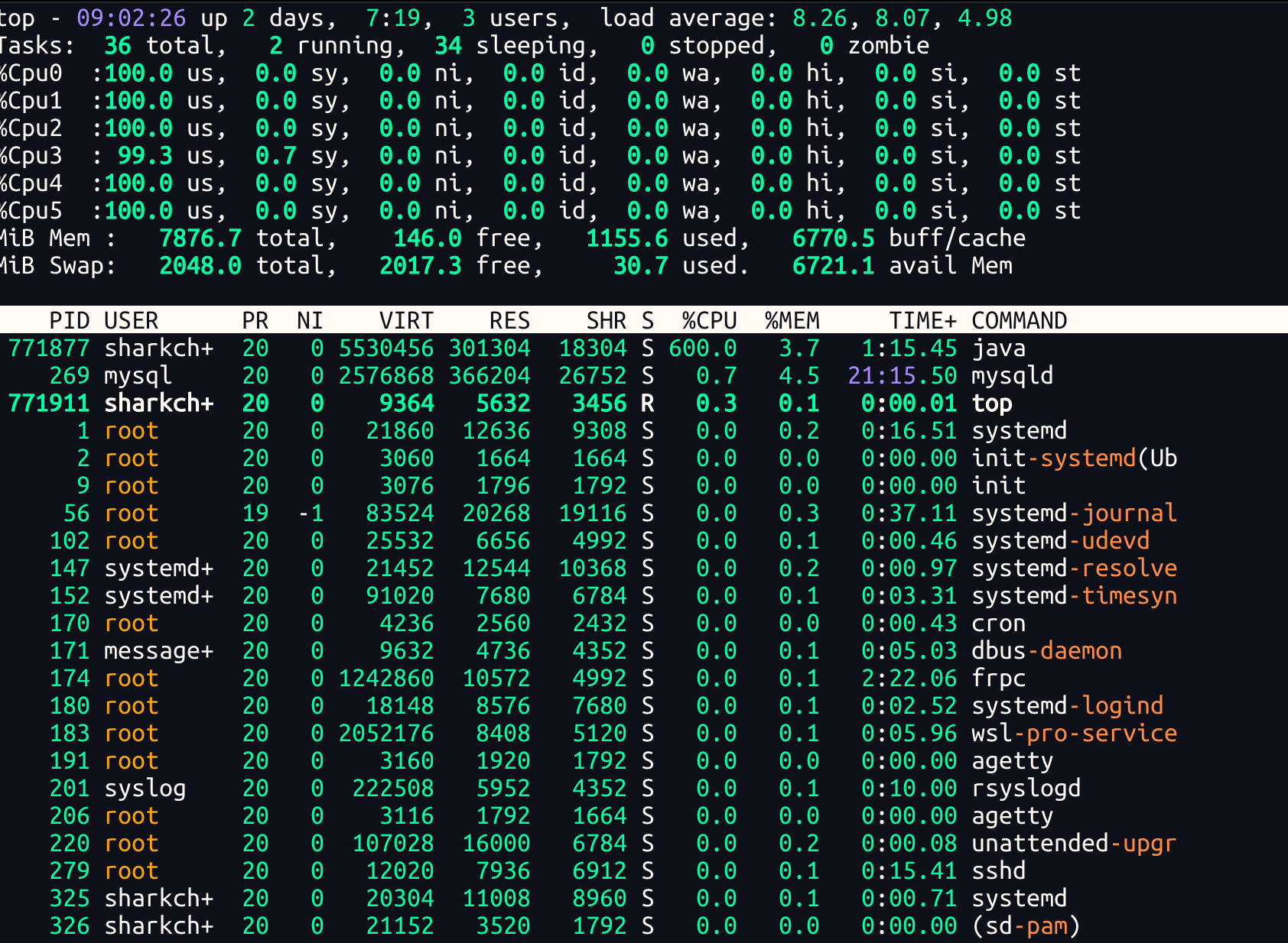 - 当前系统运行java、Nightingale、frpc、mysqld等多个进程,且均匀分布在各个cpu