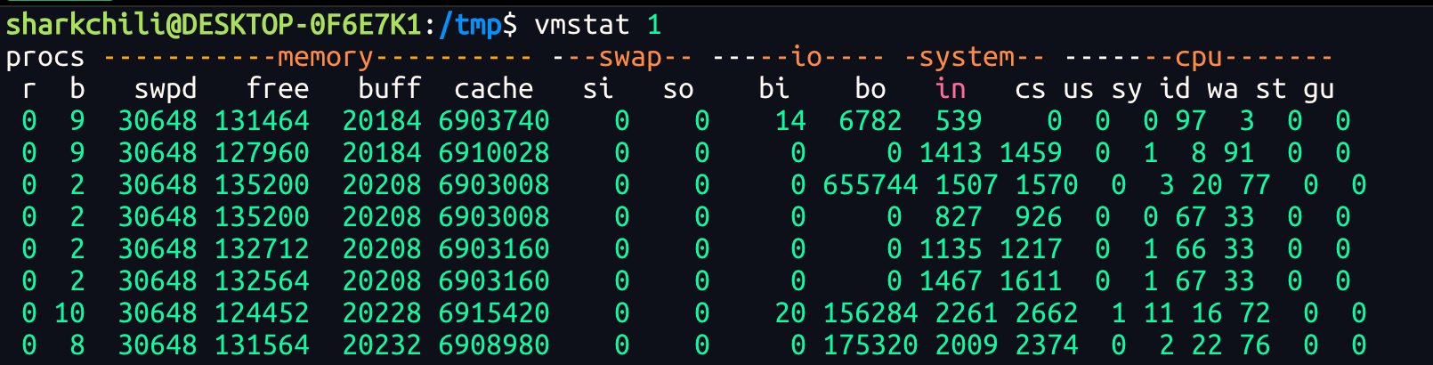 procs -----------memory---------- ---swap-- -----io---- -system-- -------cpu-------
