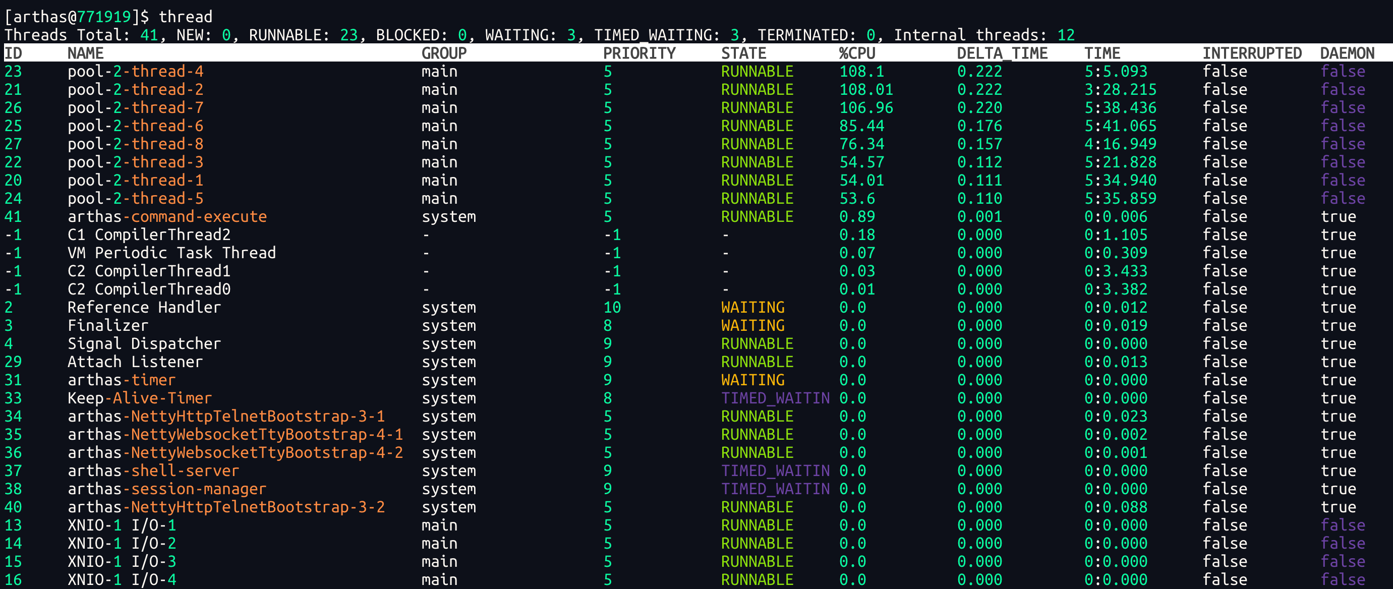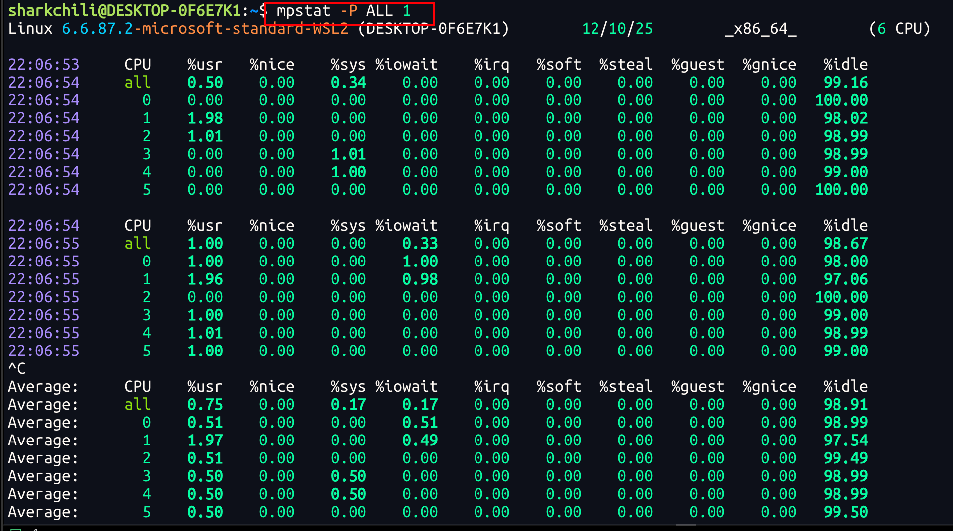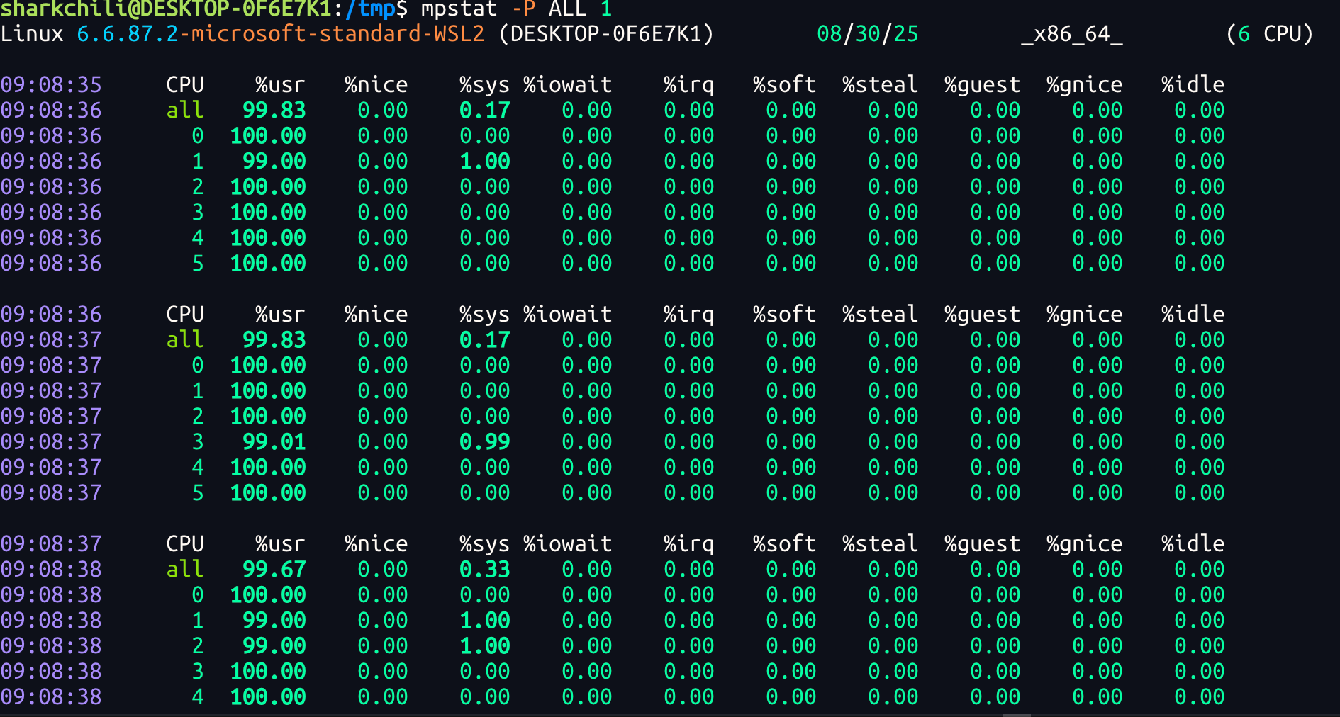 从笔者的输出结果来看,各CPU核心的使用率分布相对均匀,没有出现某个CPU核心使用率异常飙升的情况。如果某个CPU核心使用率持续接近100%,而其他核心相对空闲,则可能说明存在以下问题: