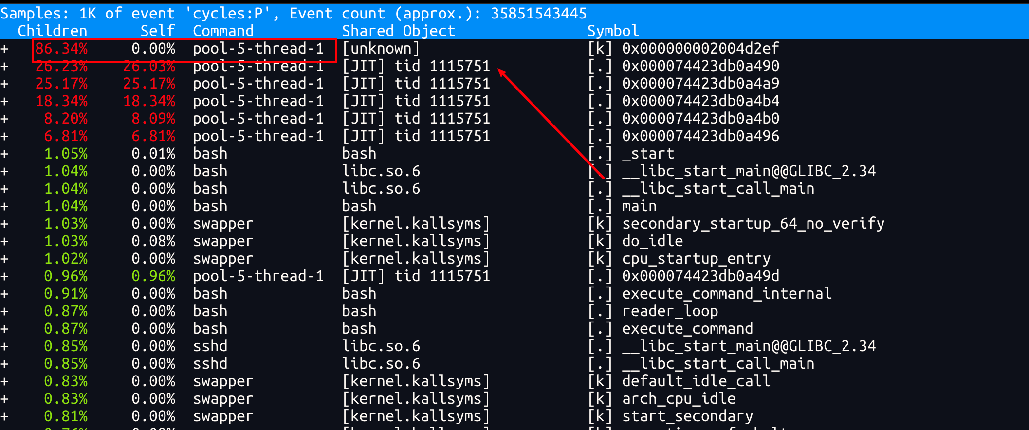 此时,通过sudo perf report查看报告,可以看到一个pid为1115751的Java进程对应线程CPU使用率飙升到86,此时我们就可以基于这条信息到指定的进程上查看该线程是否存在密集的运算: