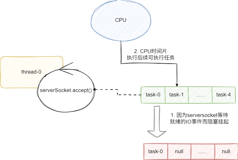 第一种是线程执行IO请求,在等待IO资源返回,触发阻塞,此时线程就处于BLOCKED状态,例如服务端server执行serverSocket.accept()等待就绪的客户端接入: