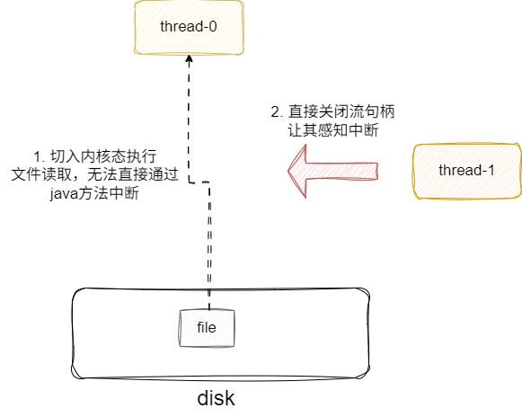 对应的我们以文件IO为例给出代码示例,可以看到我们通过继承thread重写其中断方法,当我们需要打断系统资源时,直接关闭其流通道让工作线程感知到这一点,然后通过原生interrupt修改中断状态:
