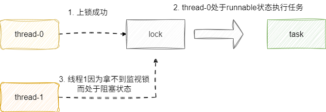 因为并发互斥原因,线程需要等待其它线程释放监视锁而进入BLOCKED阻塞态: