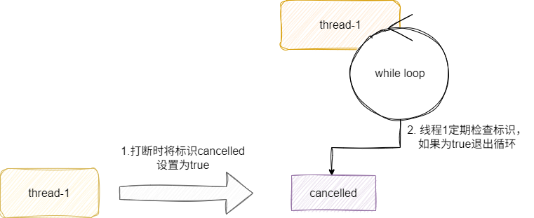 cancel方法修改线程中断状态 run方法执行业务逻辑,并定期轮询检查中断标识,一旦标识被设置为true则退出循环,结束线程