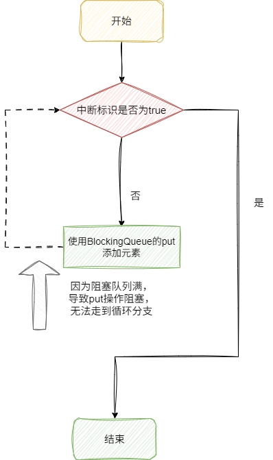 //2.收到异常中断,小心保存中断状态,继续阻塞等待元素返回