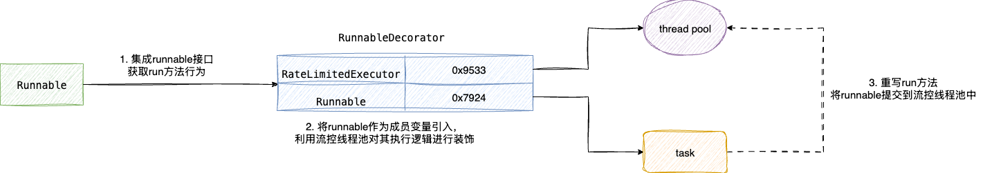 与之对应我们再利用装饰者模式封装一个RunnableDecorator作为提交任务给RateLimitedExecutor的任务工具,其核心步骤为: