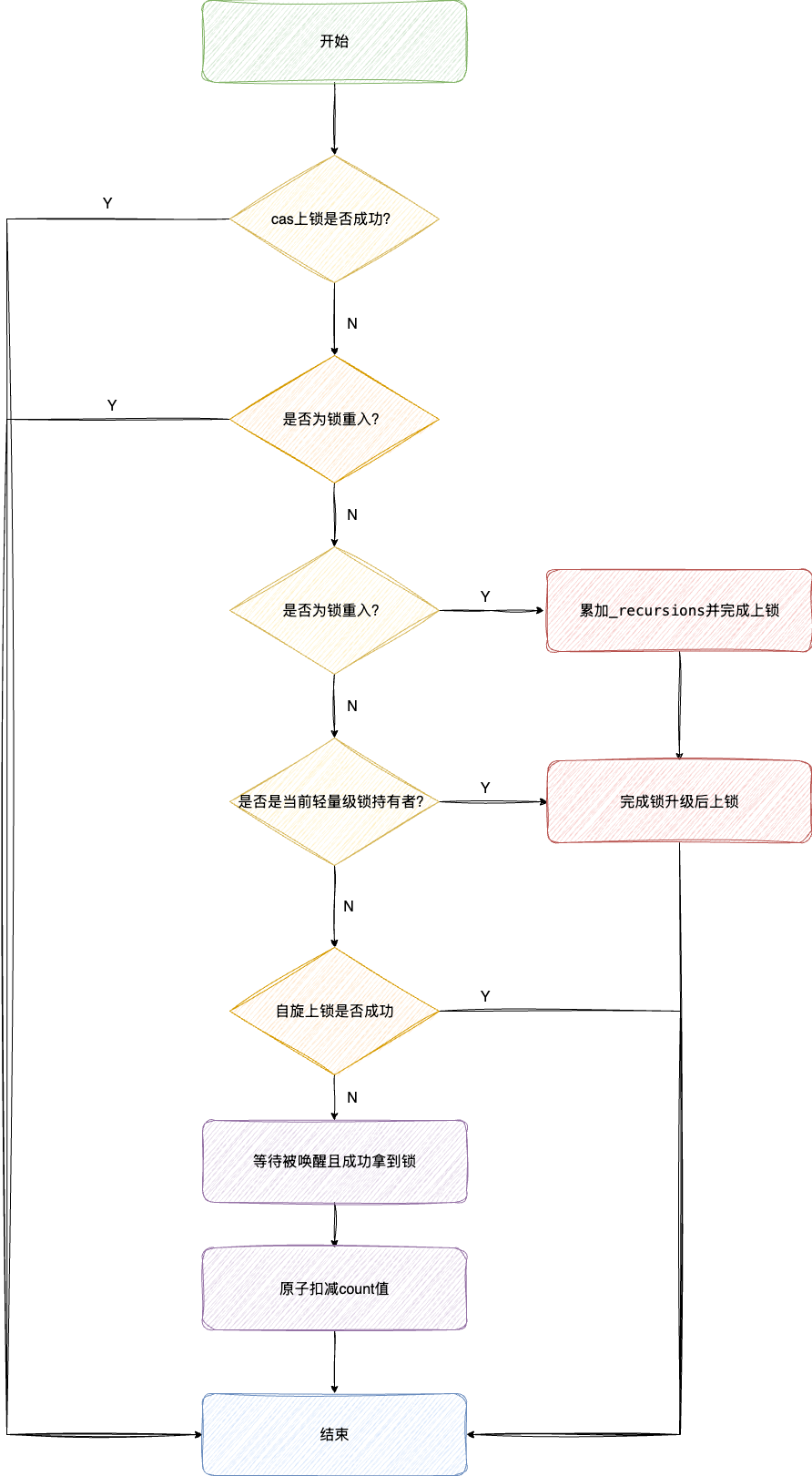 cas将null设置为当前线程的指针,如果cas方法返回null则说明自己获取锁成功直接返回,反之进入步骤2 - 如果非空但返回指针地址是自己,说明当前线程之前已经获取过一个这把锁,本次为锁重入,直接累加重入次数