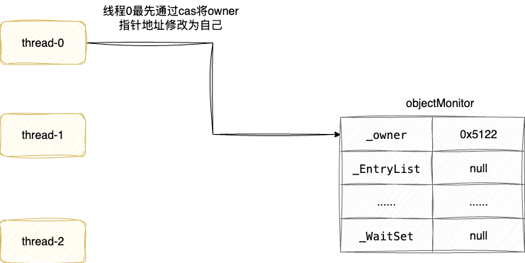 我们先从全局的维度了解一下synchronized关键字的实现,假设我们现在有三个线程尝试争抢对象锁,此时线程0最先通过CAS机制将锁的持有者标识为自己并成功获取锁,对应的线程1和线程2则CAS失败。此阶段线程0就可以操作锁内部对应的临界资源,即synchronized底层锁持有者标识就是_owner字段指向线程0:
