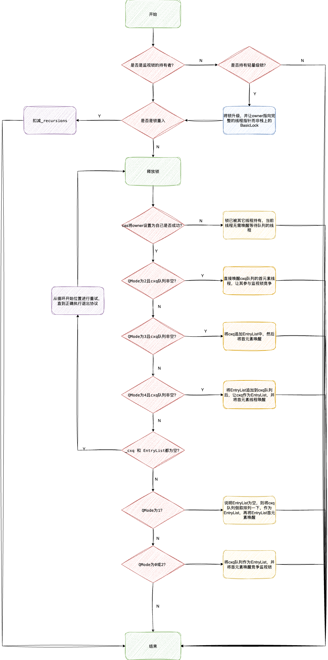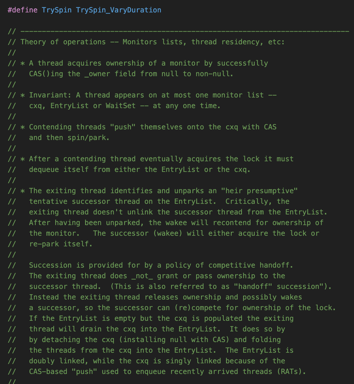 上述说明我们也可以在源码objectMonitor.cpp中的注释中查阅到,感兴趣的读者可以翻阅这段注释了解具体的实现细节,其大体意思与上述描述基本一致。对应的,笔者简单概括如下: