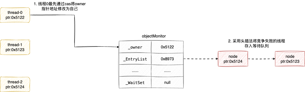 _count:等待获取该锁的线程数,通常为_cxq和_EntryList队列中的线程数总和_waiters:调用wait方法进入等待状态的线程数_owner:指向当前持有锁的线程_recursions:线程重入次数,用于记录当前线程对同一把锁的重入次数