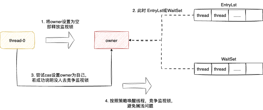 然后就是挂起锁释放的场景,线程0期间因为特定原因,主动挂起调用wait方法,此时就需要完成锁释放操作,对应底层操作则是将其存入等待队列_WaitSet中,并将_EntryList中等待的线程唤醒尝试竞争锁(注意,不一定完全是_EntryList,这里更多是为了举例做一个普适的说明):