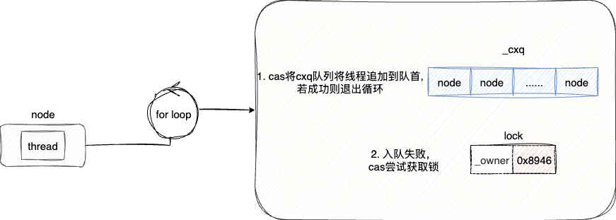 竞争锁资源的enter方法在明确几次cas和自旋失败后,会将其添加到cxq队列中,但设计者并不会直接添加,而是尽可能利用每一次机会,利用我们将线程封装为等待节点会通过cas存入等待队列,为了尽可能利用每一次cpu时间片,再进行cas自旋入队时,设计者会利用每次cas失败的时机再次尝试自旋上锁,这本质就是对于入队激烈竞争的一种临时规避,尽可能利用这个间隙再次获取锁资源: