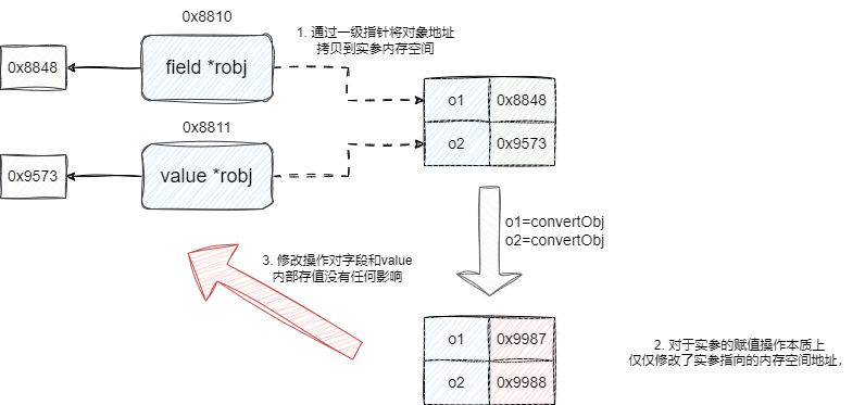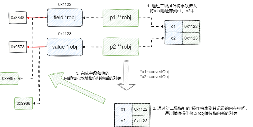 这里补充的go语言的实现细节,读者可按需了解,因为在指令解析阶段笔者将所有参数都封装为robj指针,所以笔者在传入的字段和值都是通过二级指针进行操作,原因很简单,因为go语言是值拷贝语言,如果我们传入字段和值的一级指针,这意味着我们内部针对指针的修改操作仅仅是影响实参的指向地址: