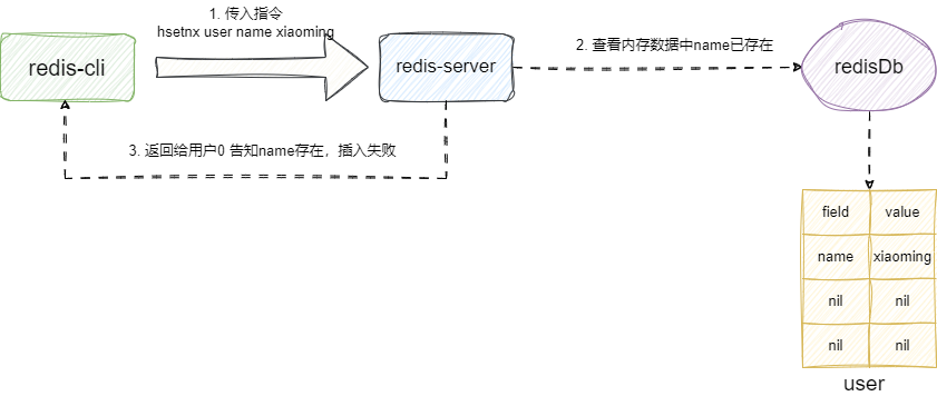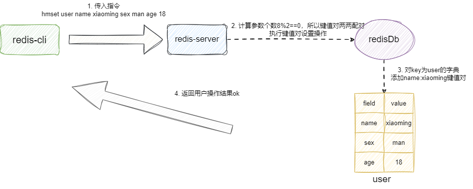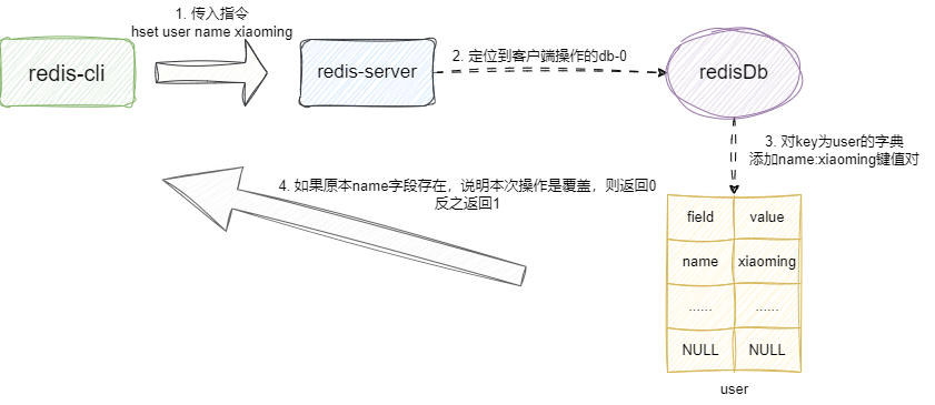 而hset指令的实现细节也比较简单,我们还是以上面那条指令为例,它首先解析用户传入指令,得出要操作的key为user,找到后将name和xiaoming这个键值对插入,如果这个键值对之前存在说明本次操作是覆盖操作,则返回用户0,反之说明本次键值对操作是插入操作则返回1: