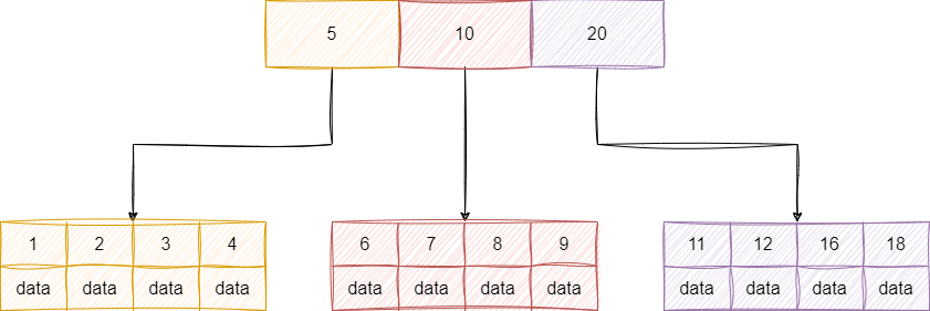 而B+树,可以看到每个非叶子节点存储的都是子节点的指针,而叶子节指向被索引的数据,而且这个树是按照顺序进行排序的,所以b+树是非常适合范围查询的。