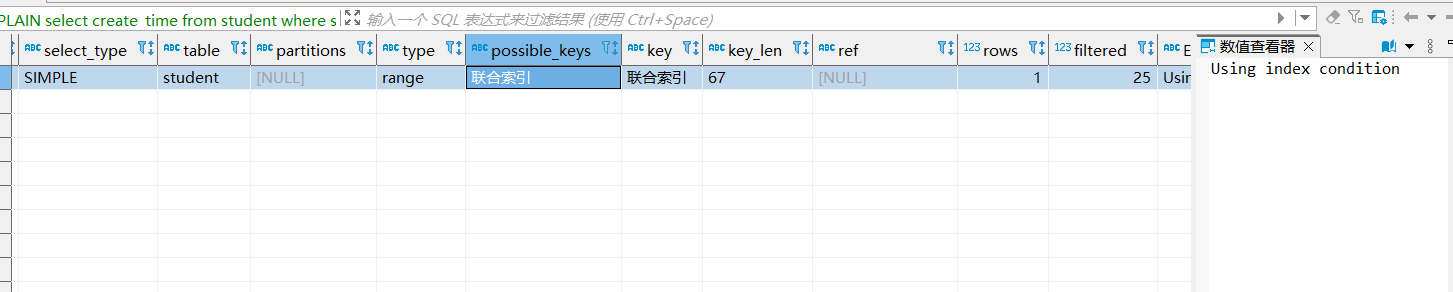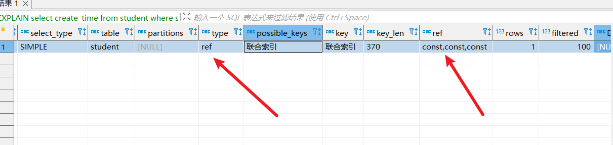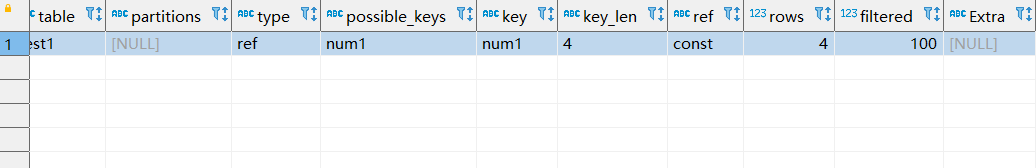 先来看看这句,num1为key,查询条件右边为int类型。从执行计划可以看出查到了4条数据,并且走了索引