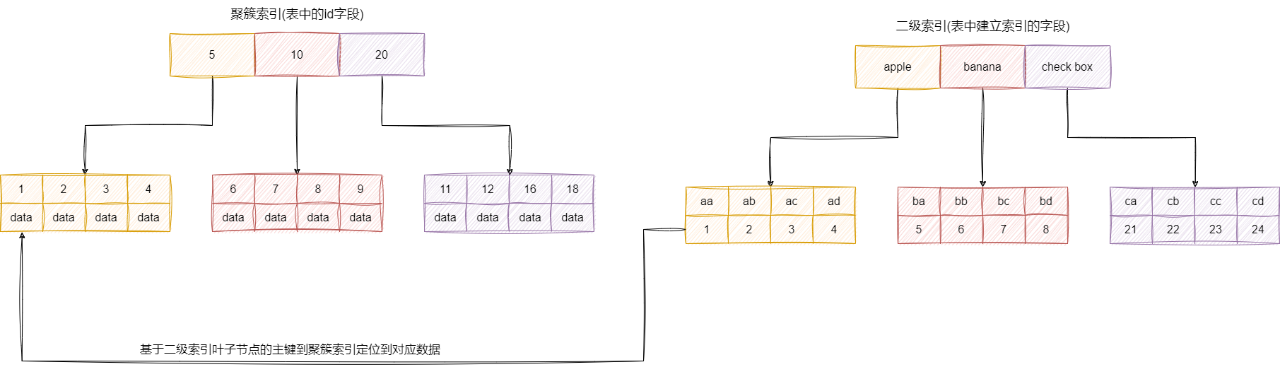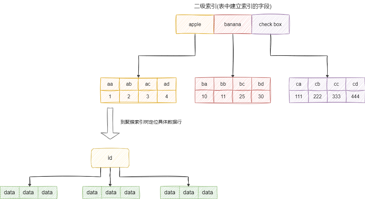 我们再说说非聚簇索引,它也不是一种索引类型,是一种索引结构和数据分开的的索引。MyIsam使用的就是非聚簇索引,而常用的InnoDB的二级索引用的也是非聚簇索引。非聚簇节点的叶子节点存放的不一定是数据的指针,以二级索引为例,它存放的就是索引以及索引对应主键的值,通过这个值我们可以通过回表查询到对应的数据。