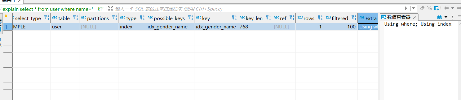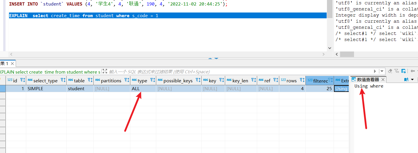 再来看看这句,左边为int,右边为字符串,从执行计划看出他也是走索引查到的数据也是4条