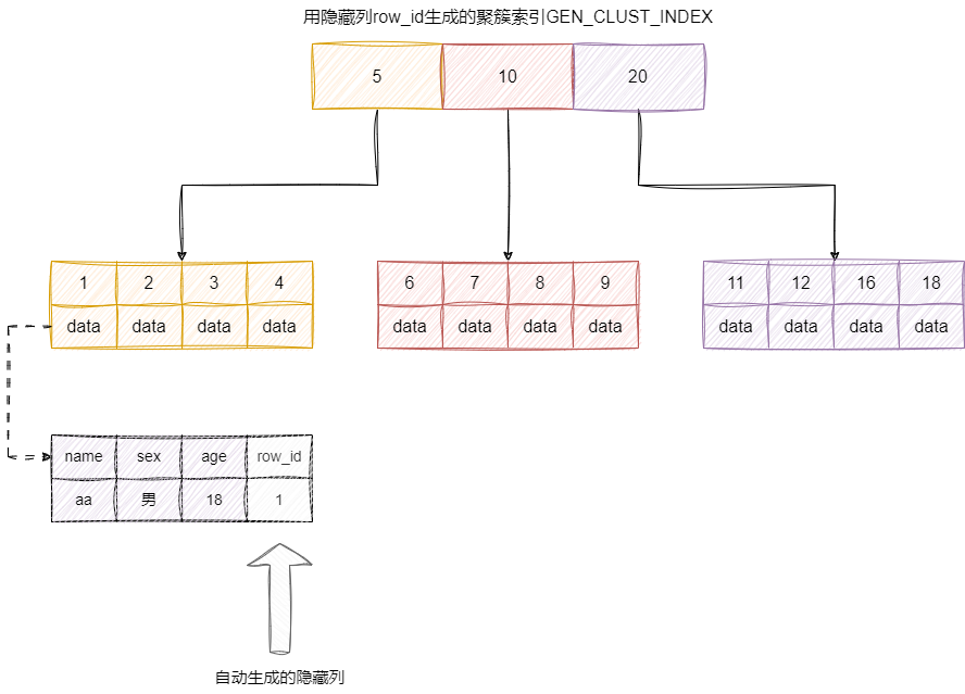 实际上在我们数据表中有创建主键索引的情况下,那么这个索引结构就是基于我们自定义的主键索引字段。若没有的话,InnoDB 会从表中找到不为null的唯一索引字段作为主键索引。若还是没有那么InnoDB 就会自己生产一个6byte的字段row_id作为自增主键,并为其生成GEN_CLUST_INDEX聚簇索引。