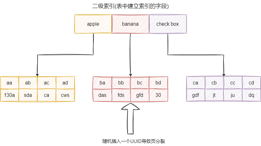UUID作为主键插入行,不仅花费的时间更长,而且索引占用的空间也更大。原因很简单,如果主键自增的话,我们顺序插入就无需维护叶子节点顺序直接追加即可,如果使用随机插入的话,很可能主键的地址和某个叶子节点地址产生冲突,可能就会导致页分裂问题: