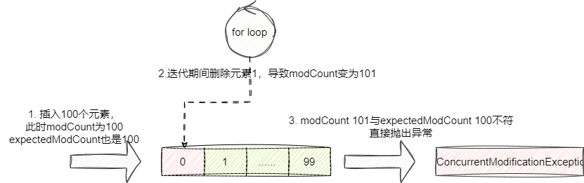 随后foreach第2轮循环发现modCount 为101,与预期的expectedModCount(值为100因为初始化插入了元素100个)不等,判定为并发操作异常,于是便快速失败,抛出ConcurrentModificationException: