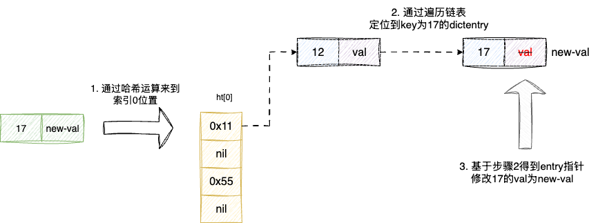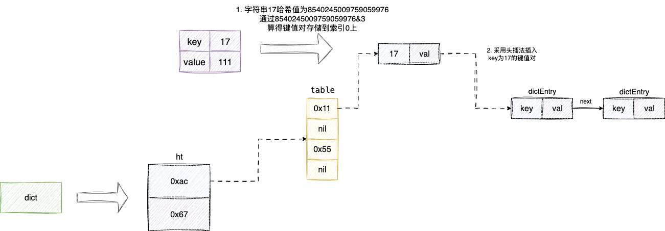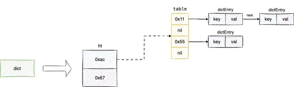 ht数组空间有限,键值对经过哈希运算存在索引冲突的情况,所以ht上每个bucket都采用拉链法解决冲突,这也就是为什么下图中的dictEntry都用箭头next指针相互关联: