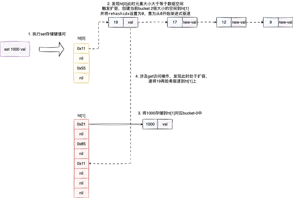 上述操作步骤如下图,当我们插入一个键值对到数组时,redis发现此时元素数量4已经等于数组大小了,于是在ht[1]创建一个2倍大小的数组并将1000存储到新的bucket中。后续执行任意get等操作,字典都会驱逐一批元素到ht[1]中,直到完成所有元素的驱逐。