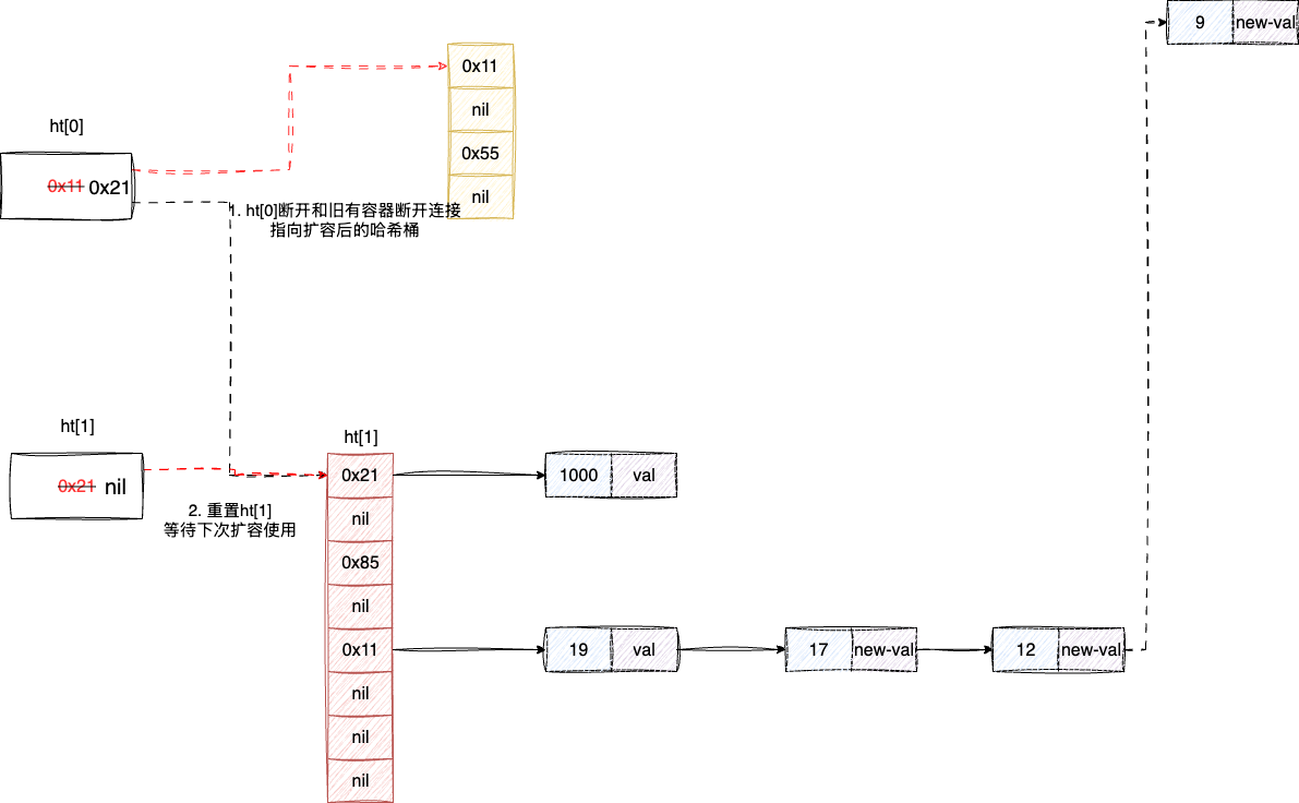 最后因为新元素都存到ht[1],且ht[0]的元素都通过渐进式驱逐的方式迁移到ht[1],此时旧有的ht[0]就没有存在的必要了,所以ht[0]就会直接指向ht[1]的数组,并将ht[1]这个结构体信息重置等待下次扩容使用,自此完成数组扩容和元素迁移: