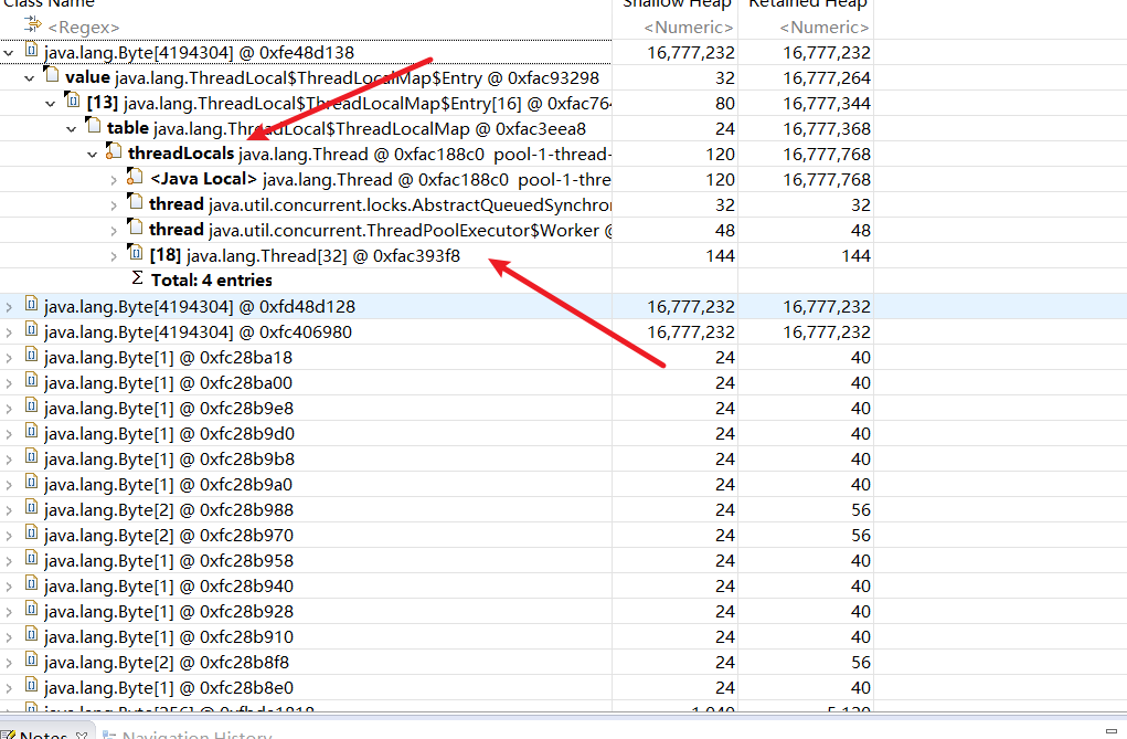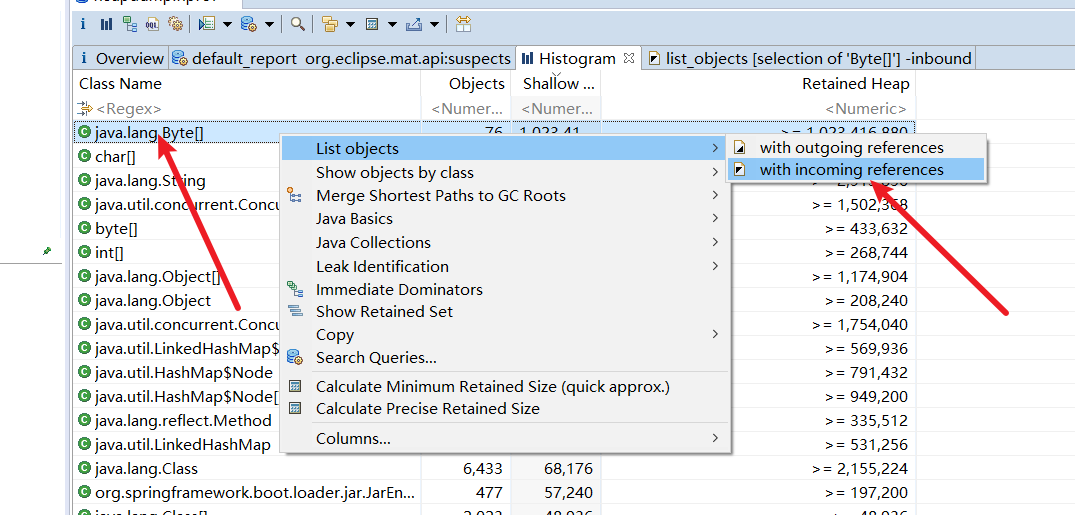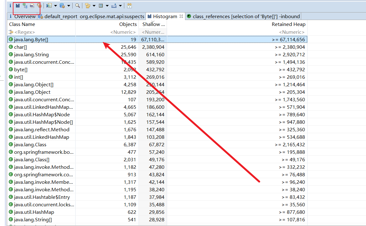 我们从上文设置的oom日志路径中找到日志/tmp/heapdump.hprof,导出到本地,使用MAT打开,找到使用率最高的Byte数组,点击下图Histogram ,点击内存占用最高的选项展开。