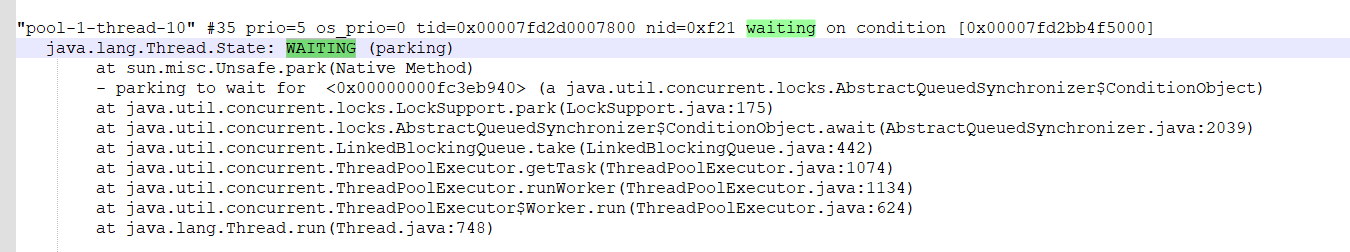 我们首先使用jstack -l 3721将日志导出,这里就以3873转为16进制查看线程状态,可以发现线程处于等待状态,而且日志中并没有存在死锁的信息,所以我们必须进一步查看堆区情况确认是否是因为内存泄漏导致的。