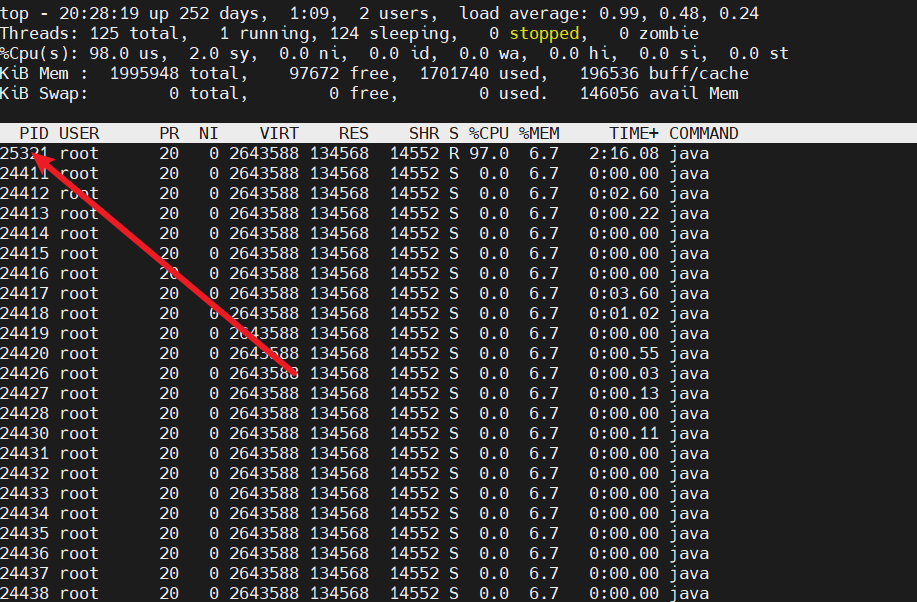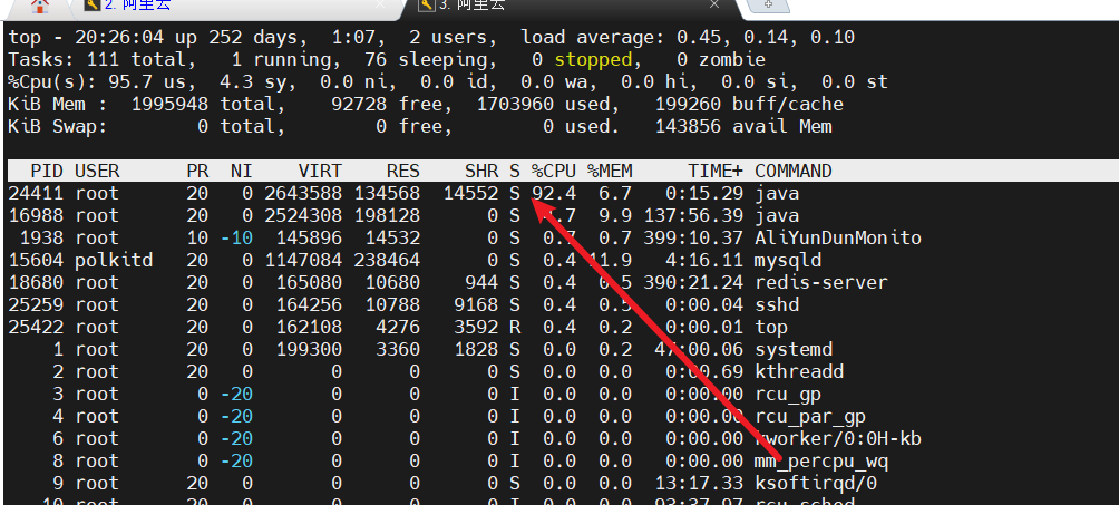 此时使用top命令查看,可以看到24411号进程CPU占用百分比飙升。此时我们就需要进一步定位这个进程的哪一个线程出问题了。