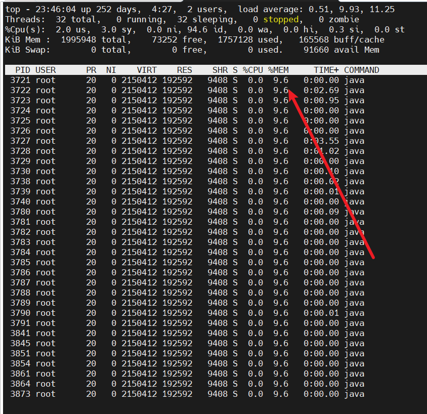 我们直接锁定java进程号之后,使用top -Hp pid查看进程的线程信息,可以看到这里面的每一个线程基本都把堆区内存打满了,我们不妨查看任意一个线程: