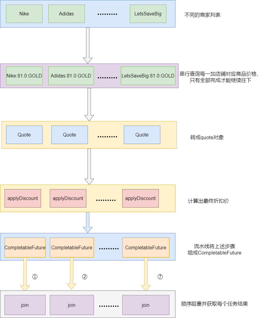 这一步我们采用CompletableFuture的组合方式,将获取售价、生成商品信息、计算最终折扣价以流的方式封装成CompletableFuture的列表,再通过join阻塞顺序获取列表中各个任务的结果。